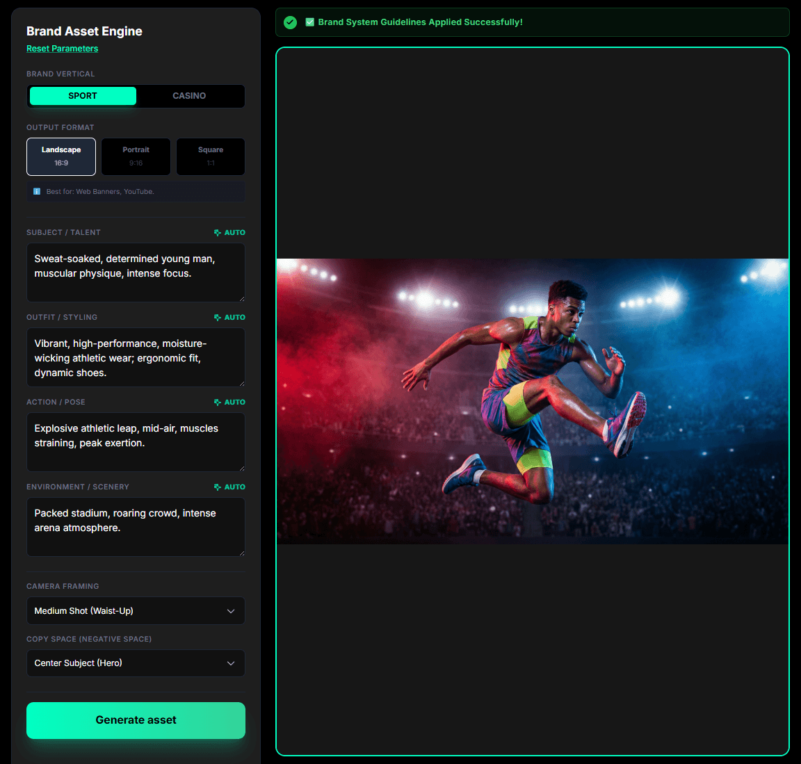 Instead of an open text prompt, I designed a UI based on Design System Tokens. Users select from pre-defined variables, Vertical (Sport/Casino), Mood, Framing, and Action, and the interface validates these inputs against brand rules before generation begins.
