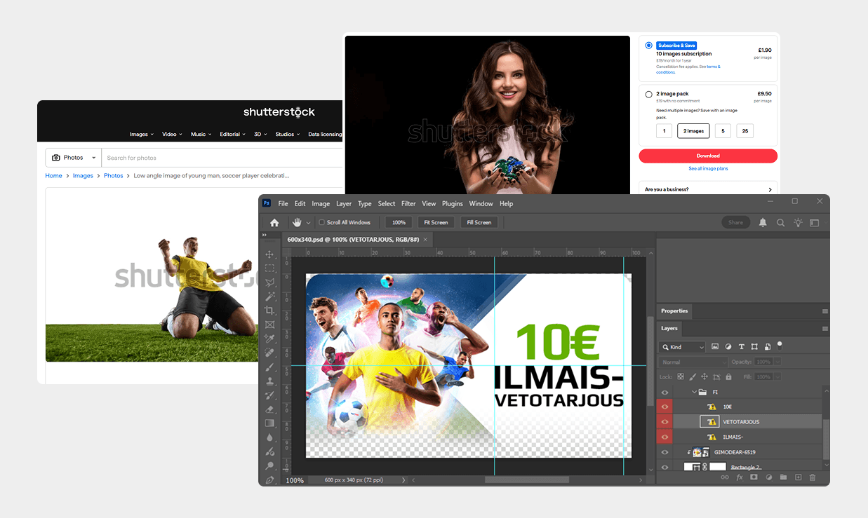 We spent hours scouring stock libraries for specific verticals (Sport and Casino), followed by extensive "surgery" in Photoshop, extracting subjects, color-grading inconsistent lighting, and manually compositing them. This left little time for strategic art direction.