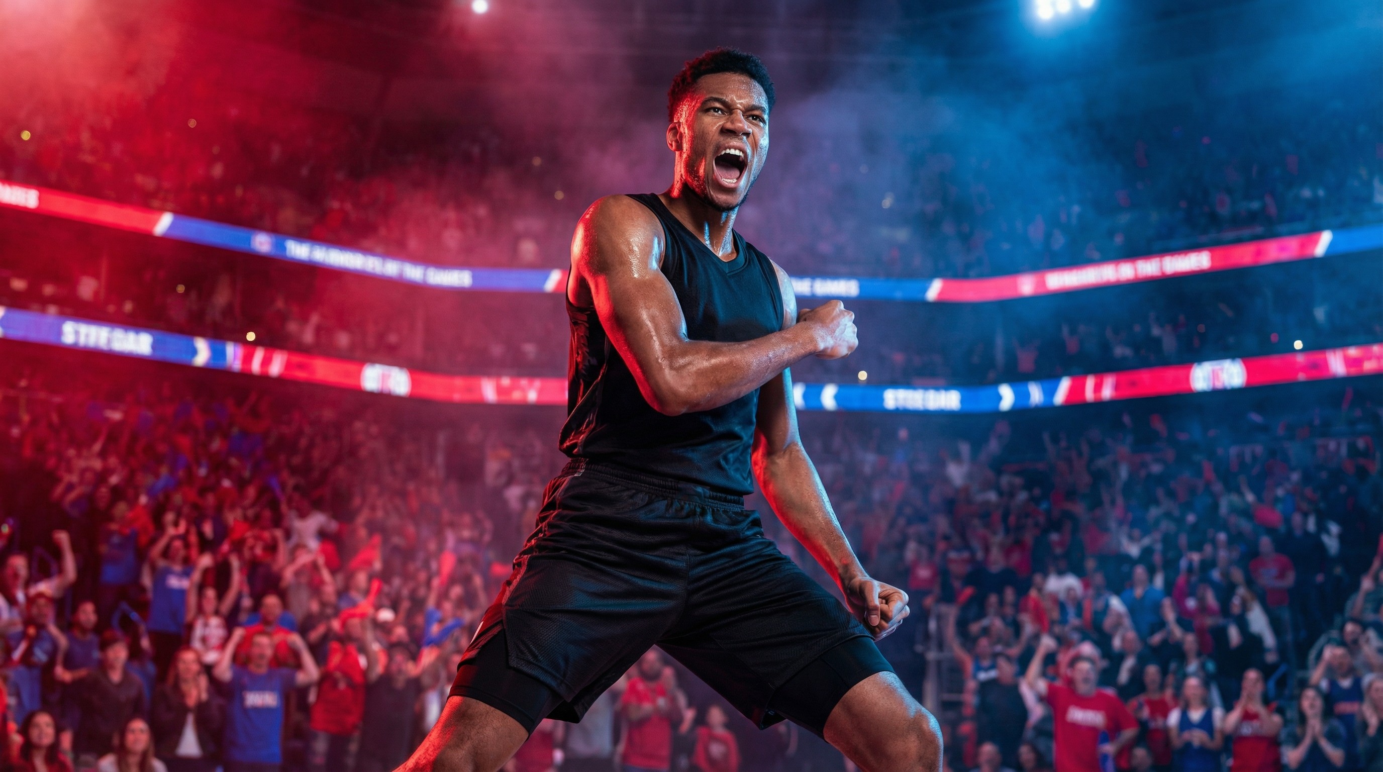 Art Direction: Raw Intensity & Athletic Performance. Lighting Palette: Cool Daylight (Stadium Floodlights) with high contrast shadows. Cyan/Electric Blue rim lights. Key Elements: Sweat spray, dynamic motion freeze, stadium crowd (blurred), high-tech sportswear fabrics.